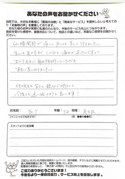 仙腸関節が痛くて歩くのも辛くて行きました。 私は足の方までしびれと痛みがあったのですが、松下先生に毎回施術をしていただき、本当に良くなりました。 他の先生も皆さん親切で明るくて今後とも通い続けようと思います!