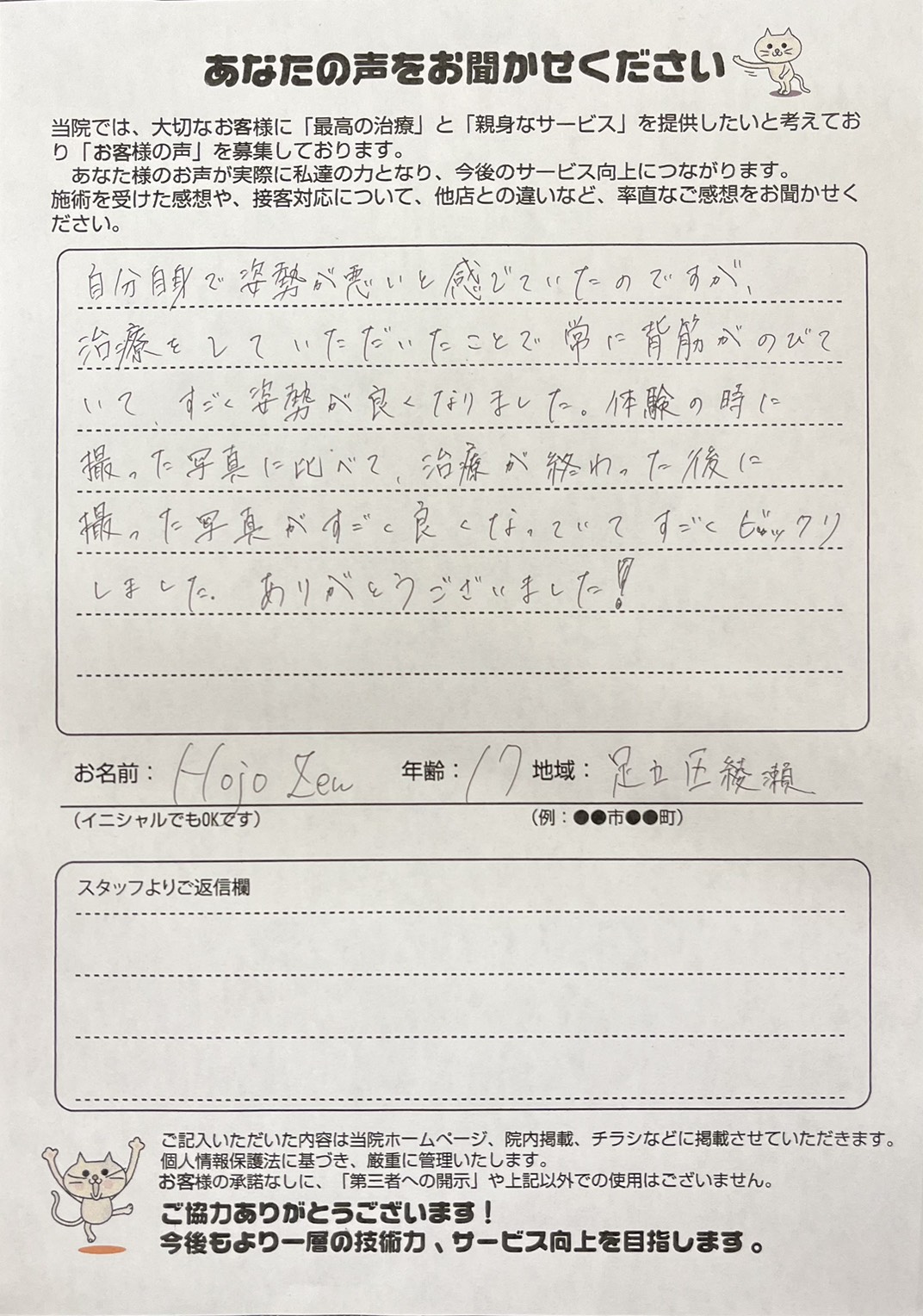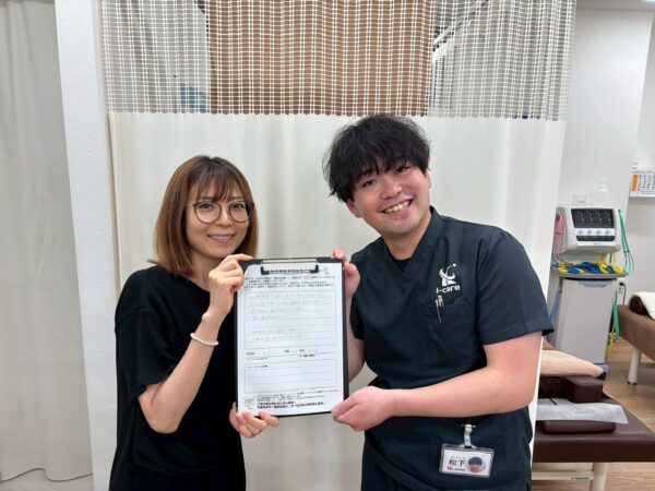 自分自身で姿勢が悪いと感じていたのですが、 治療をしていただいたことで常に背筋がのびていて、すごく姿勢が良くなりました。 体験の時に撮った写真に比べて、治療が終わった後に撮った写真がすごく良くなっていてすごくビックリしました。ありとうございました!