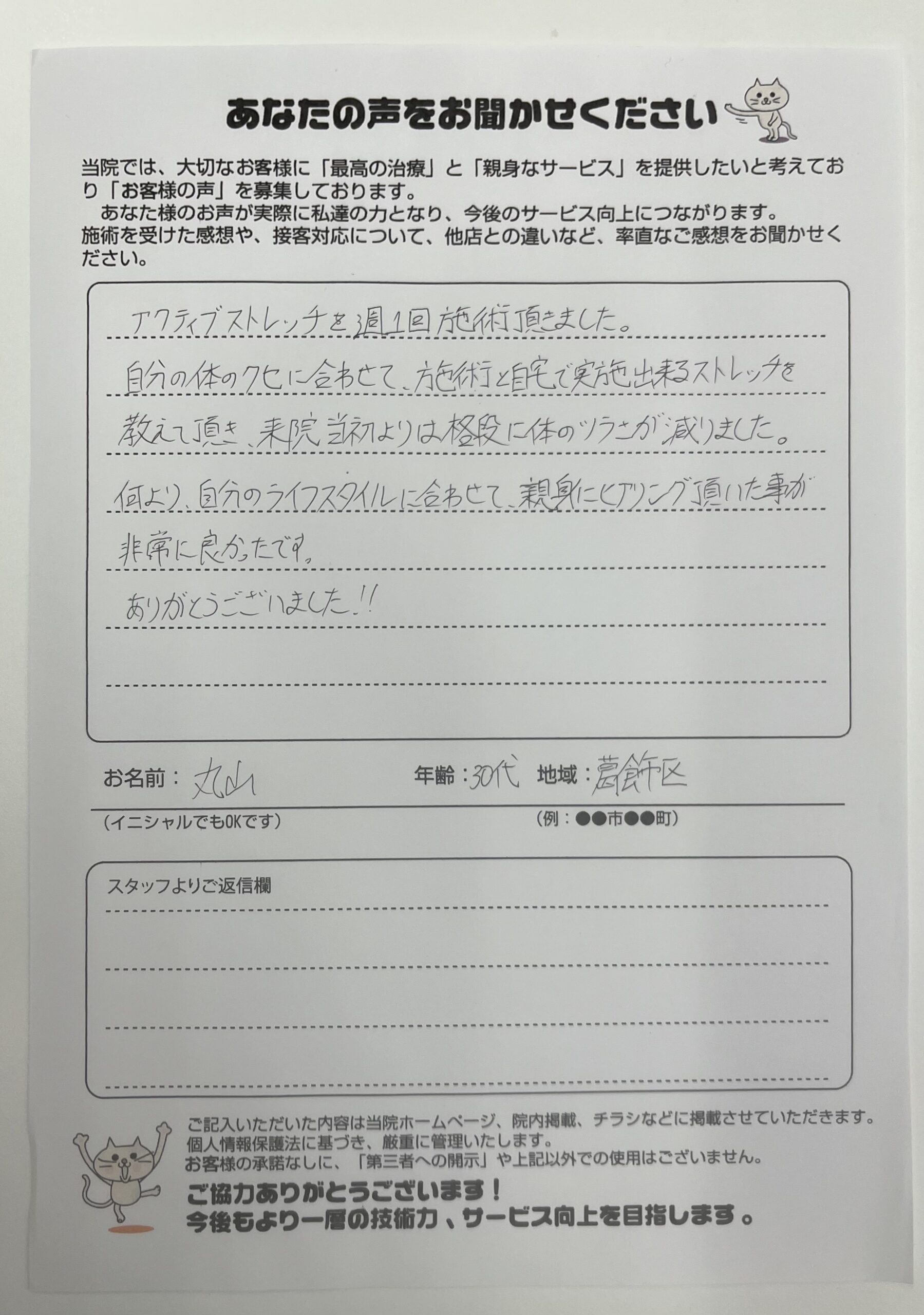 アクティブストレッチを週1回施術頂まました。 自分の体のクセに合わせて、方を術と自宅で実施出来るストレッチを 教えて頂き、来院当初よりは格段に体のツラさが減りました。 何より、自分のライフスタイルに合わせて、親身にヒいた事が非常に良かったです。 ありがとうございました!!