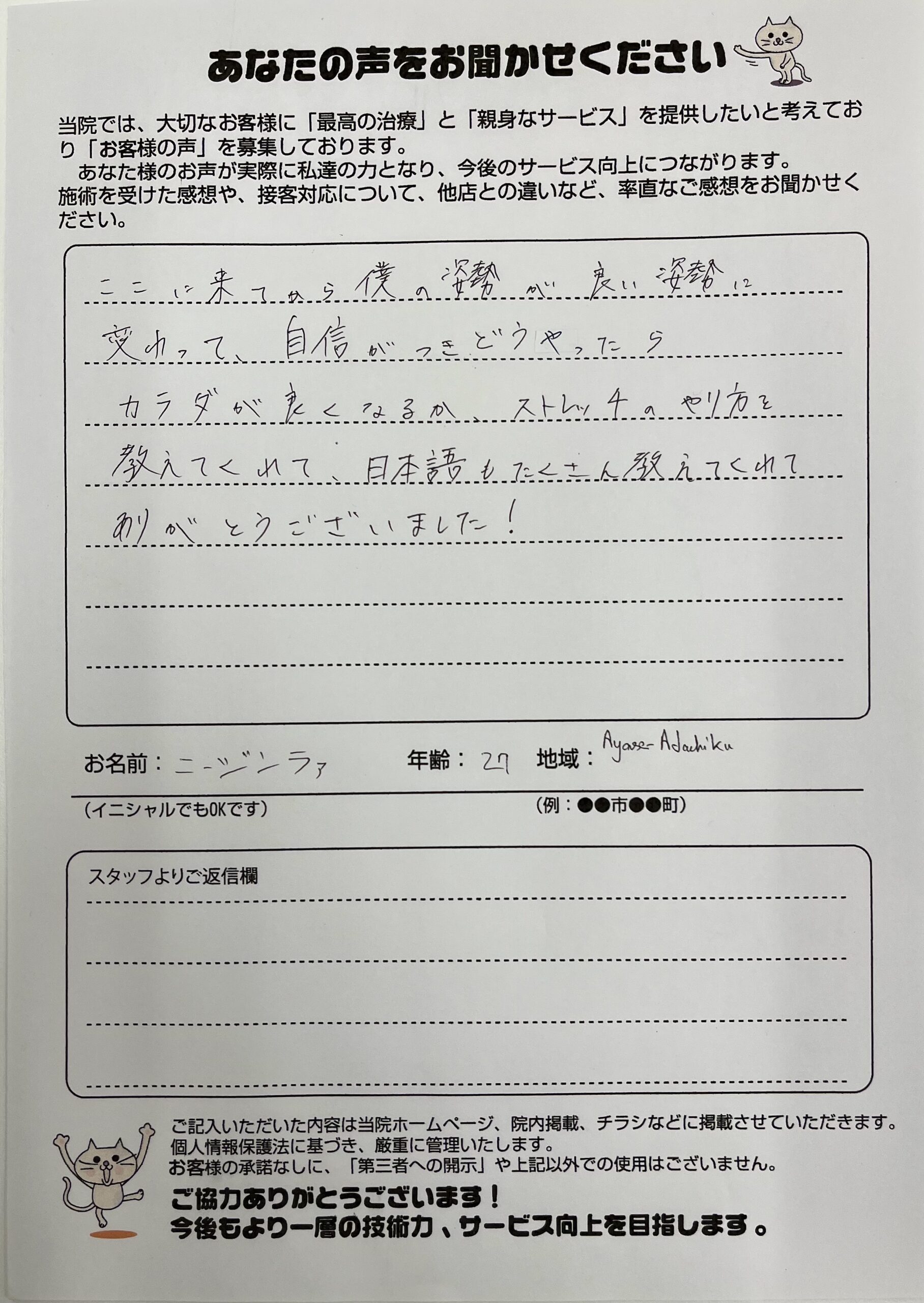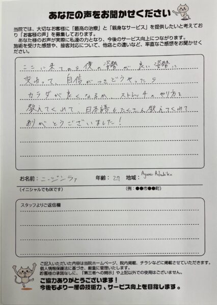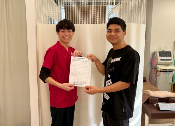 ここに来て僕の姿勢が良い姿勢に変わって、自信がつきどうやったらカラダが良くなるのか、ストレッチのやり方を教えてくれて、日本語もたくさん教えてくれてありがとうございました!