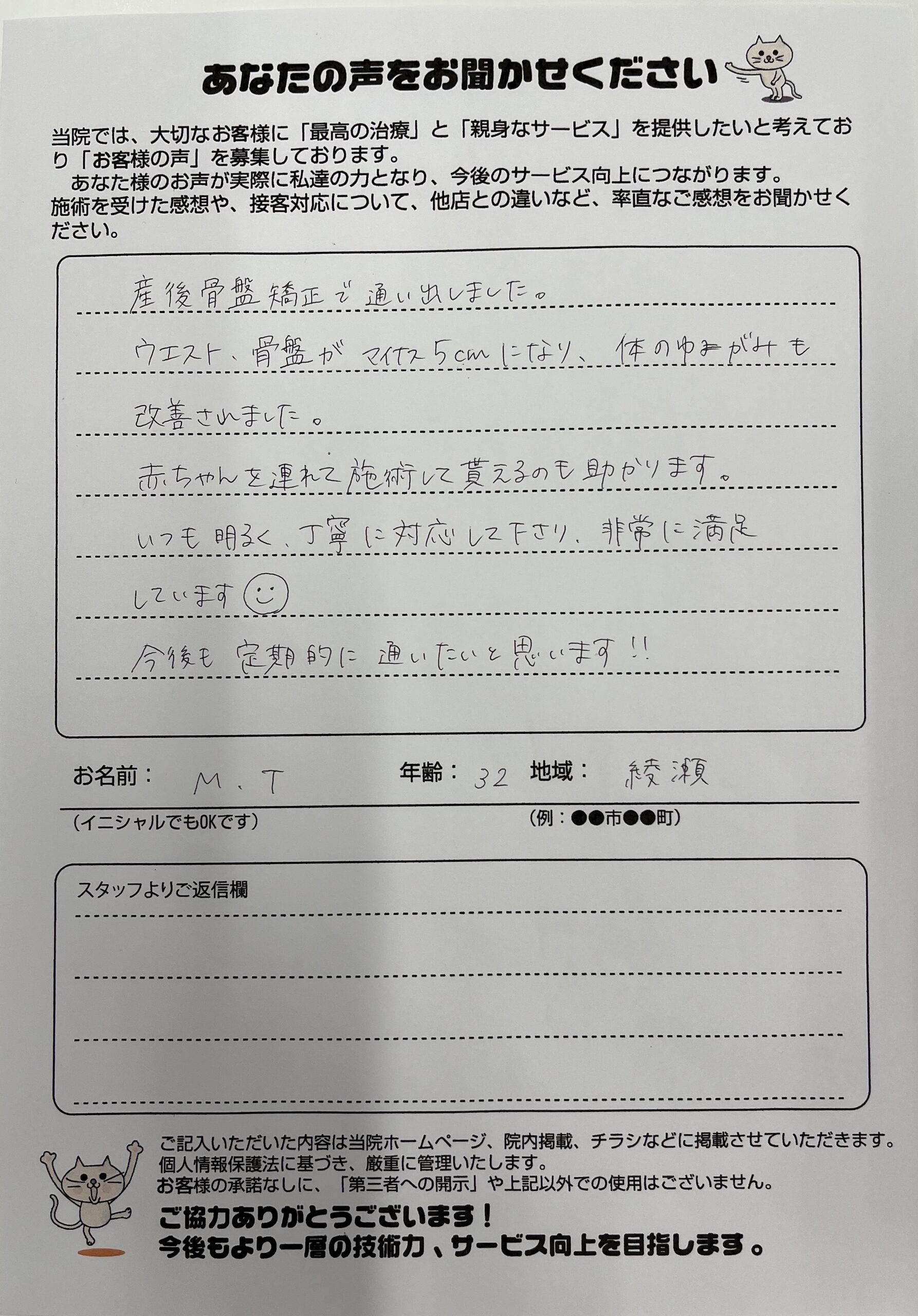 先生方はいつも明るく、体のゆがみやバランスについて丁寧に教えて下さいました。通虎のたびに体の