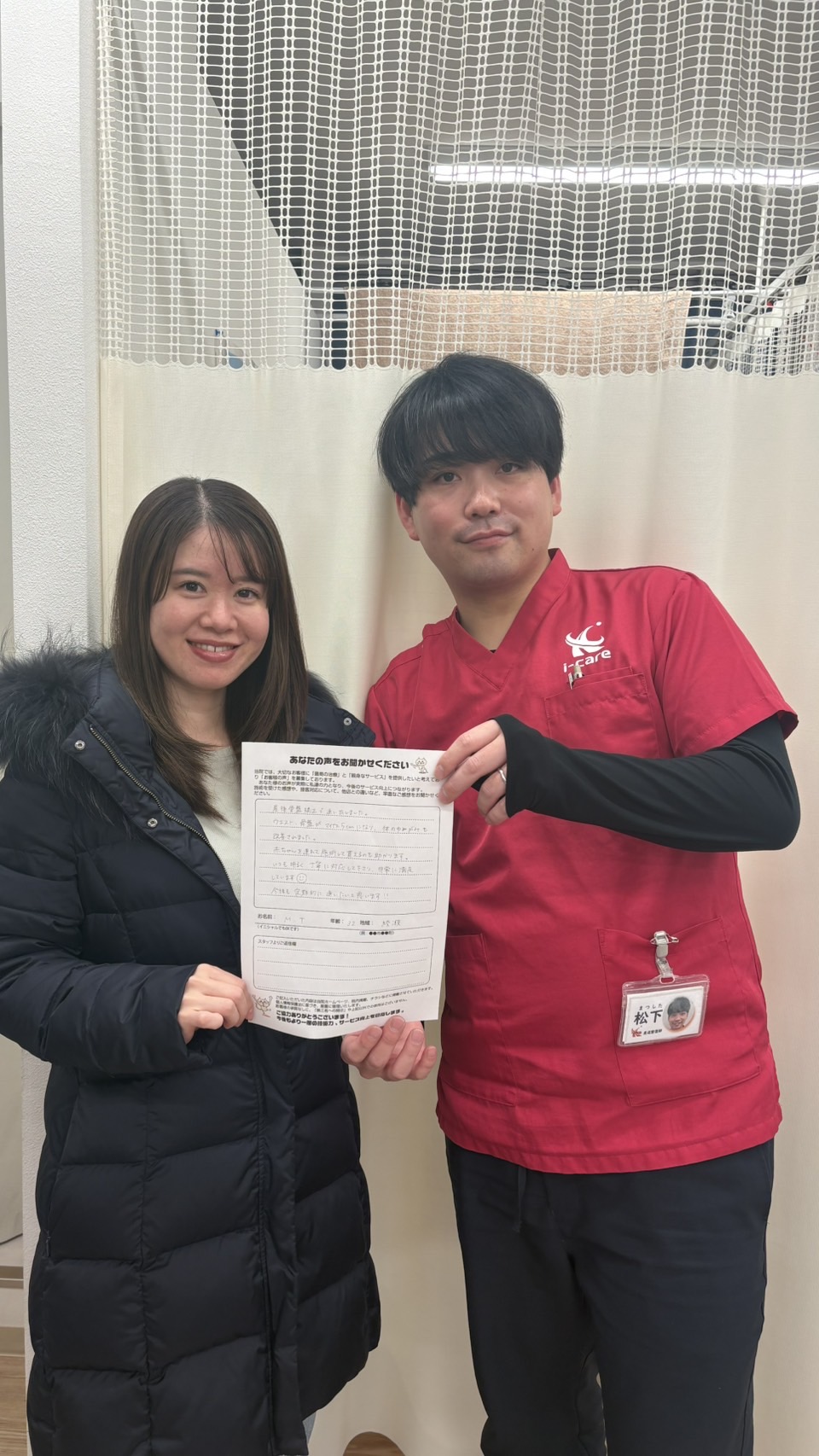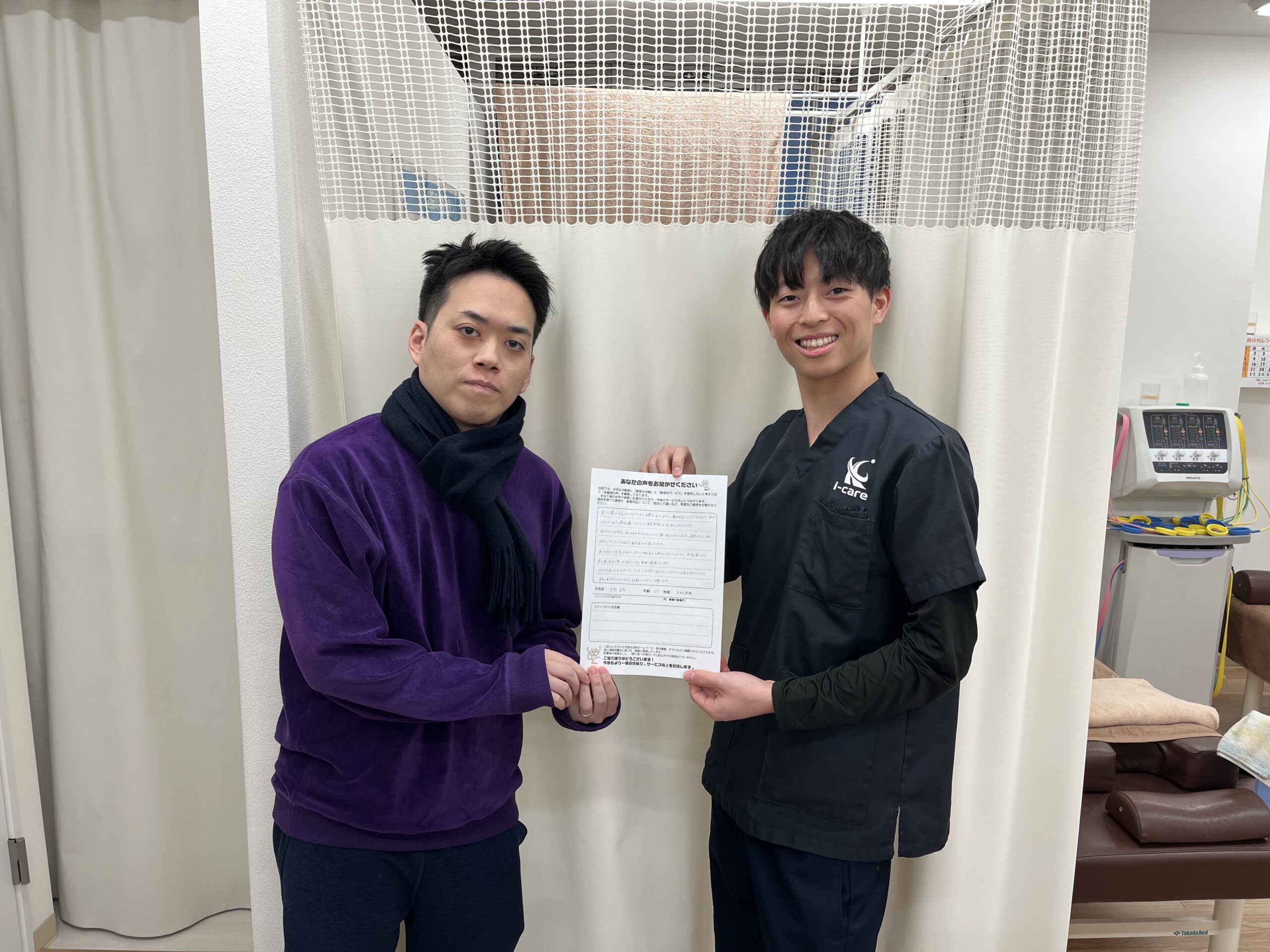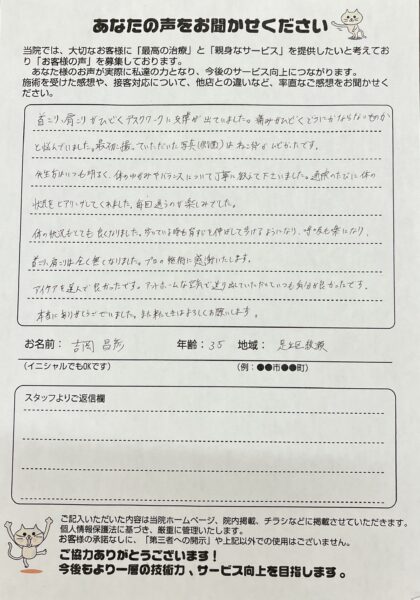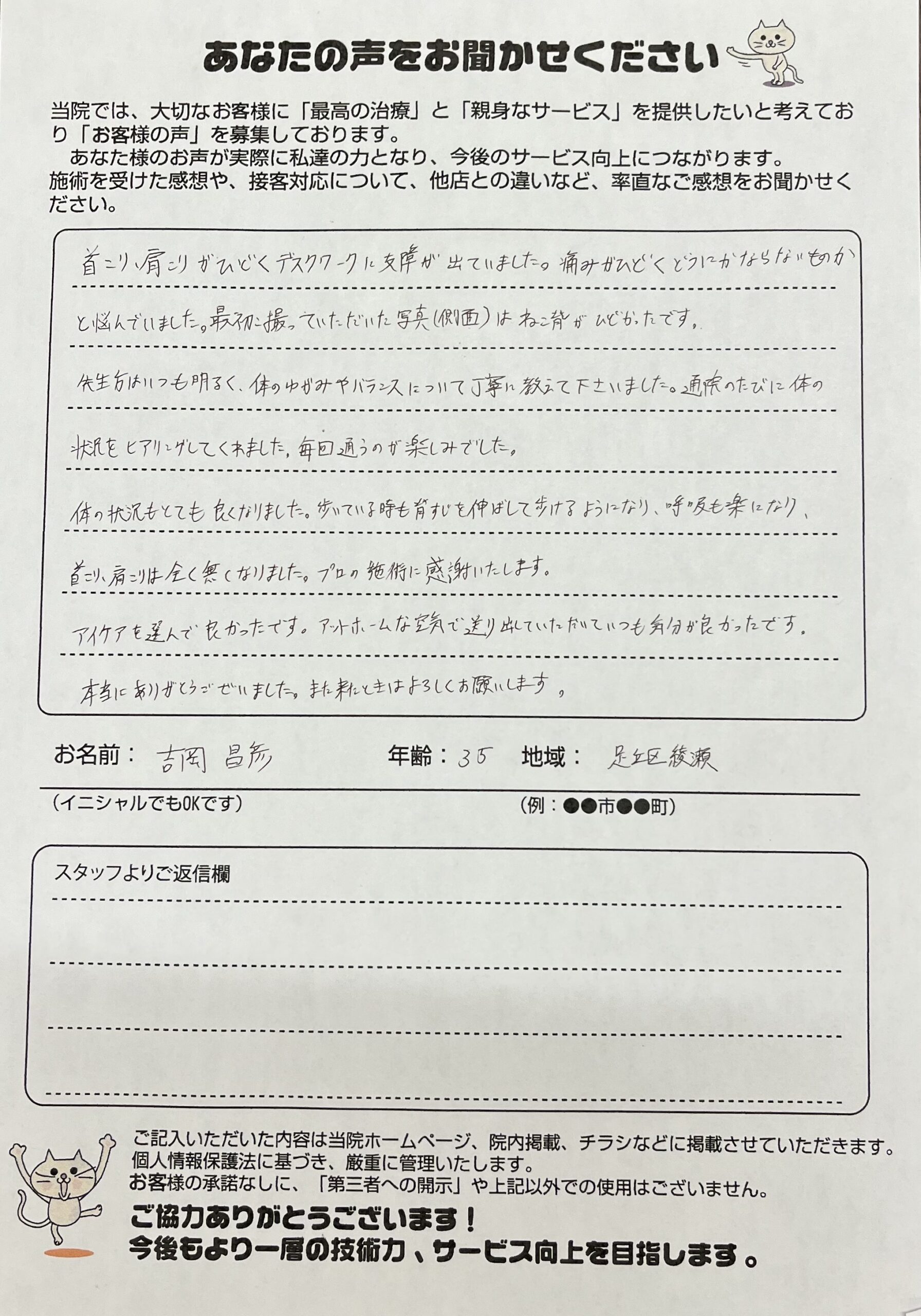首さり、肩こりは全く無くなりました。プロの施術に感謝いたします。